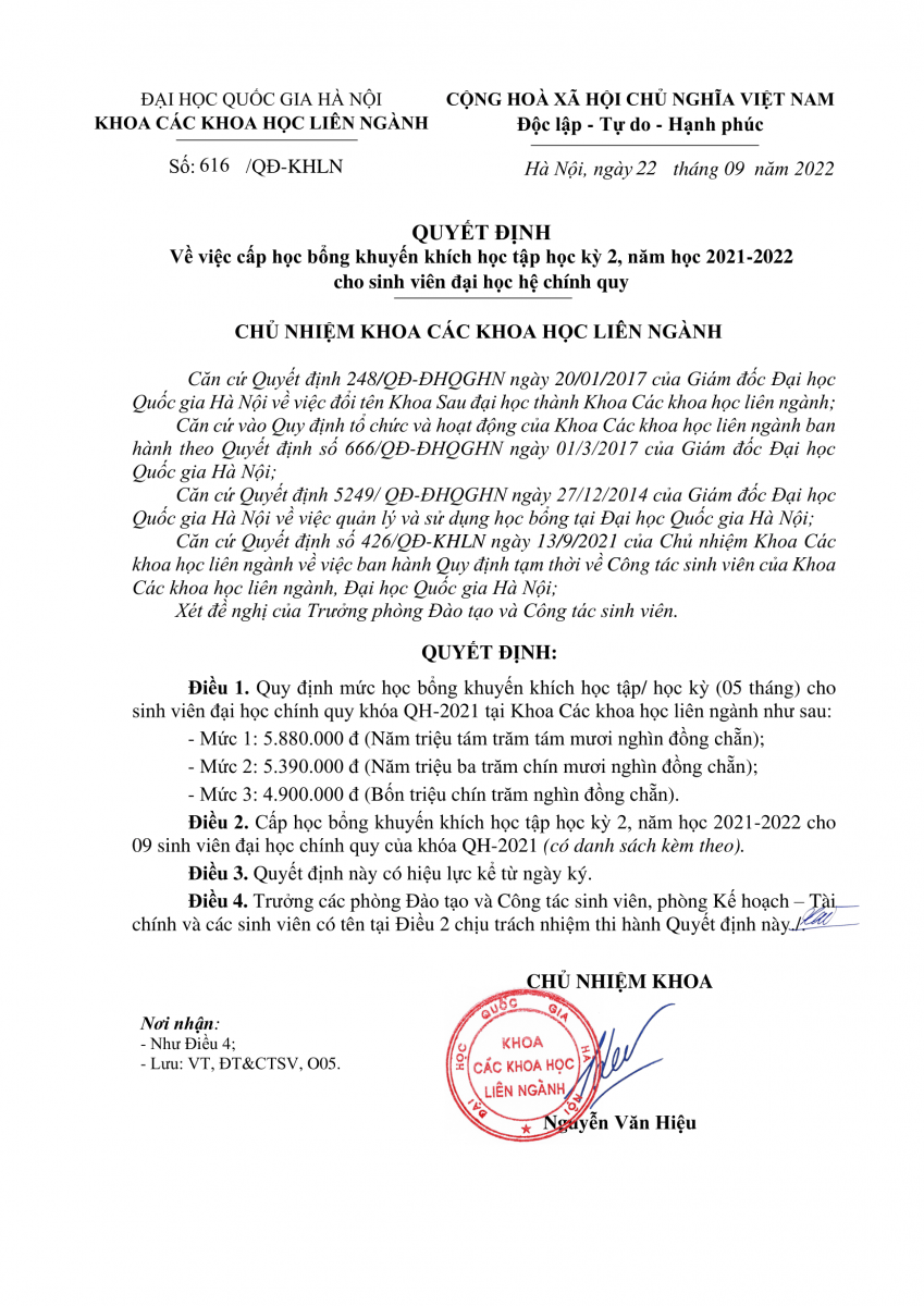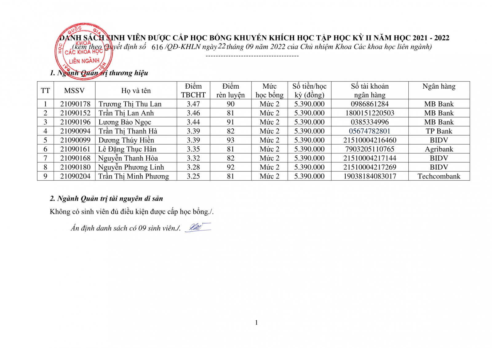 Kì II năm học 2021-2022, có 9 sinh viên thuộc ngành Quản trị thương hiệu có đầy đủ điều kiện nhận học bổng theo Quyết định số 6 /QĐ-KHLN.