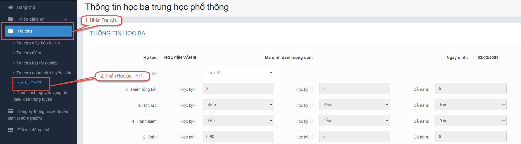 Bước 1: Thí sinh đăng nhập vào hệ thống => Nhấn Tra cứu => Nhấn Học bạ THPT