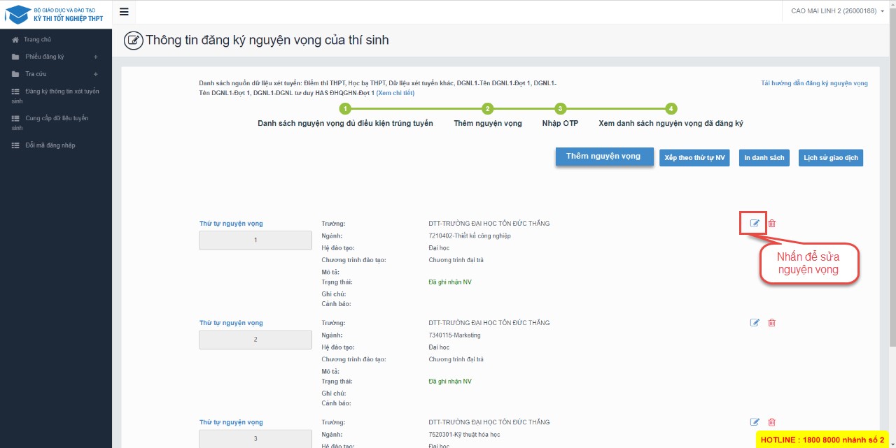 Bước 1: Tại màn hình 4. Xem danh sách nguyện vọng đã đăng ký để xem lại các nguyện vọng đã được ghi nhận. Thí sinh nhấn sửa để sửa nguyện vọng