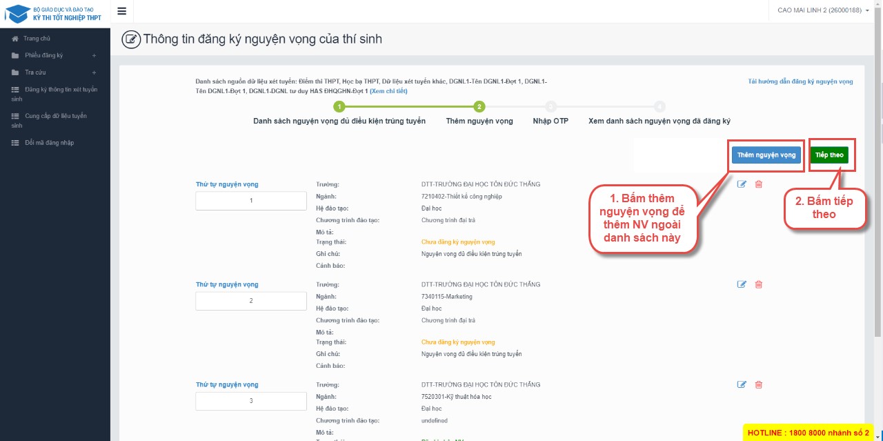 Bước 2: Sau khi sửa thông tin nguyện vọng và nhấn Tiếp theo trên màn hình 2.Thêm nguyện vọng