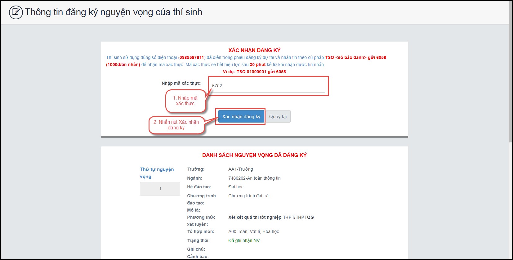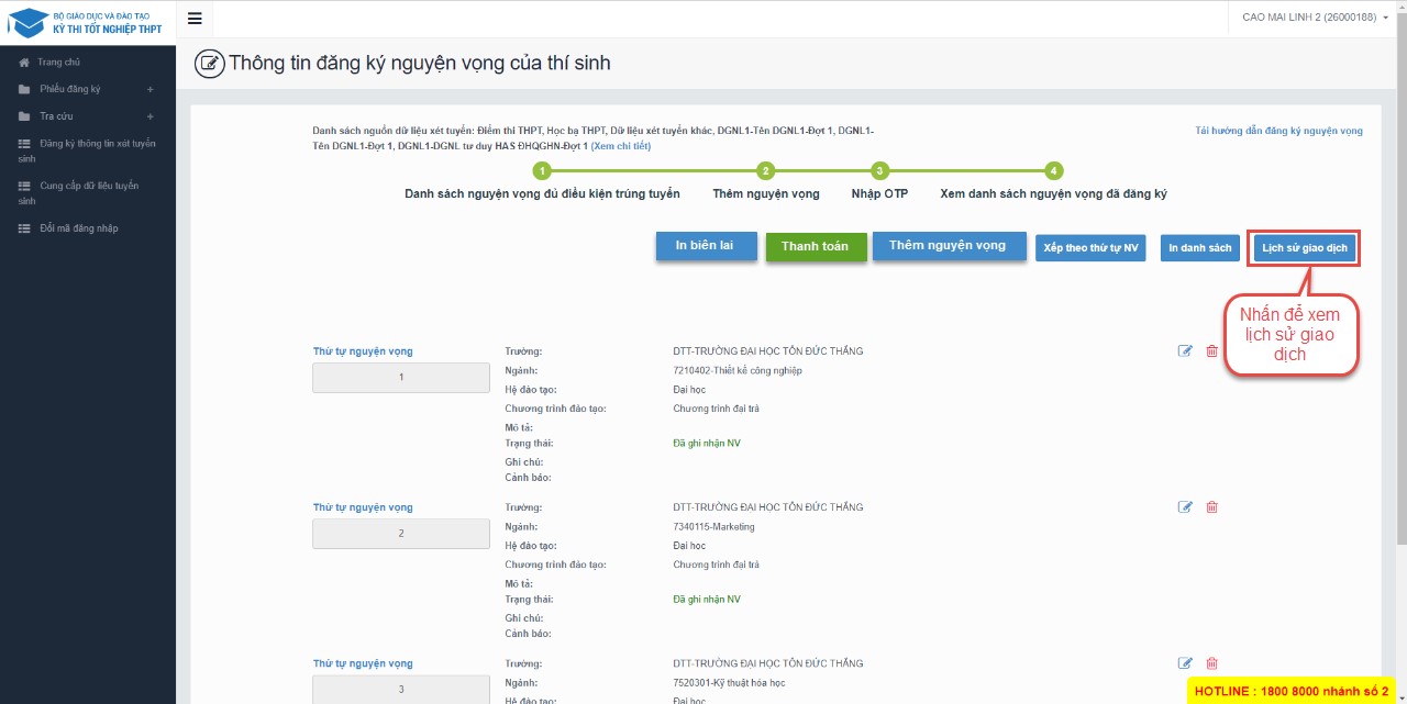** Lưu ý: Thí sinh nhập đủ các bước và kiểm tra các nguyện vọng đã được đăng ký tại bước 4: Xem nguyện vọng đã đăng ký để kiểm tra lại thông tin đăng ký