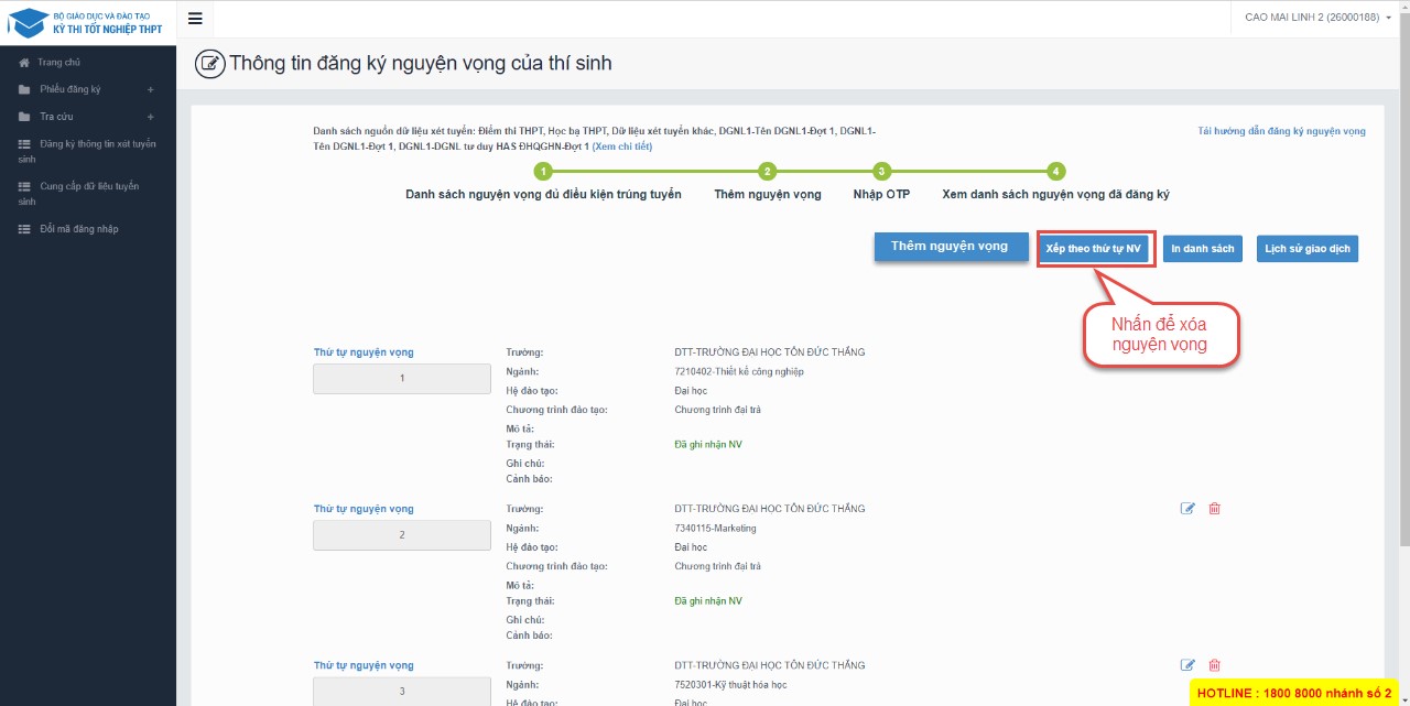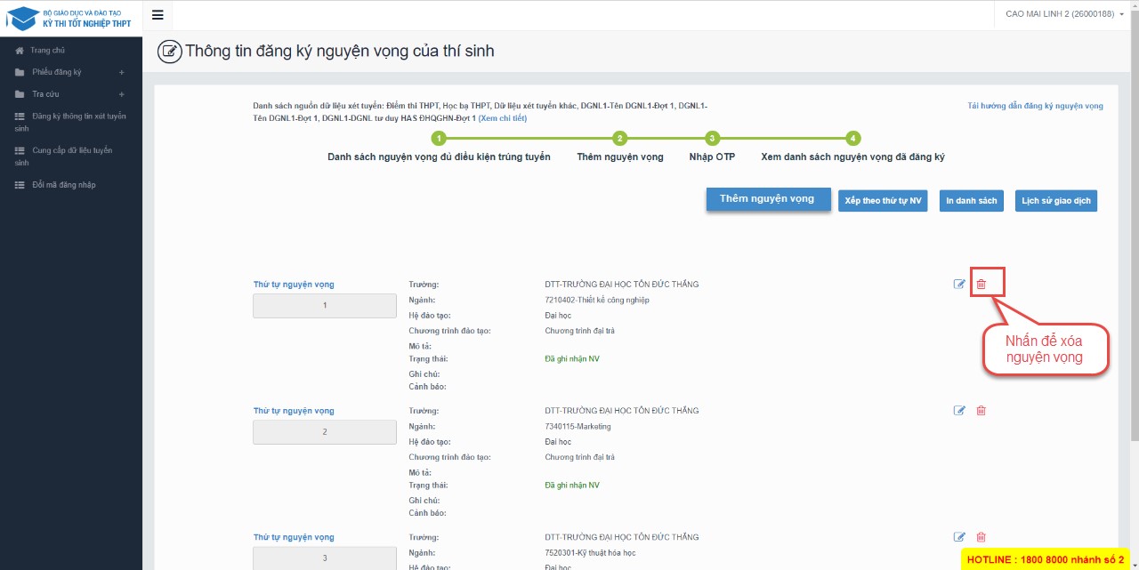 ** Lưu ý: Sau khi Xóa nguyện vọng thí sinh cần nhấn Tiếp theo và nhập OTP để lưu thông tin vừa xóa. Thí sinh nhập đủ các bước và kiểm tra các nguyện vọng đã được đăng ký tại bước 4: Xem nguyện vọng đã đăng ký để kiểm tra lại thông tin đăng ký