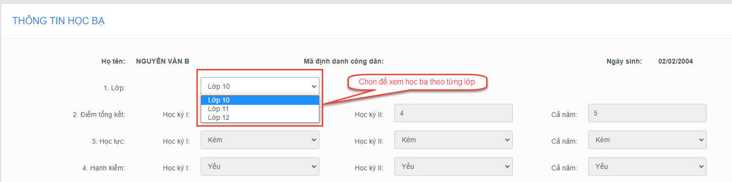 Bước 2: Thí sinh thực hiện xem điểm học bạ, Nhấn vào lớp chọn Lớp 10, Lớp 11, Lớp 12 để xem học bạ các năm học.