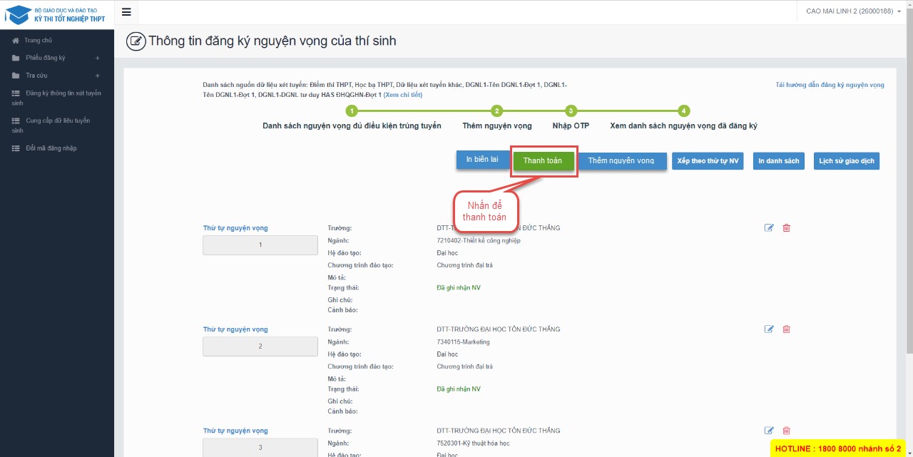 Thí sinh nhấn để thanh toán và xem HD chi tiết trong tài liệu HDSD_ThanhToanTrucTuyen