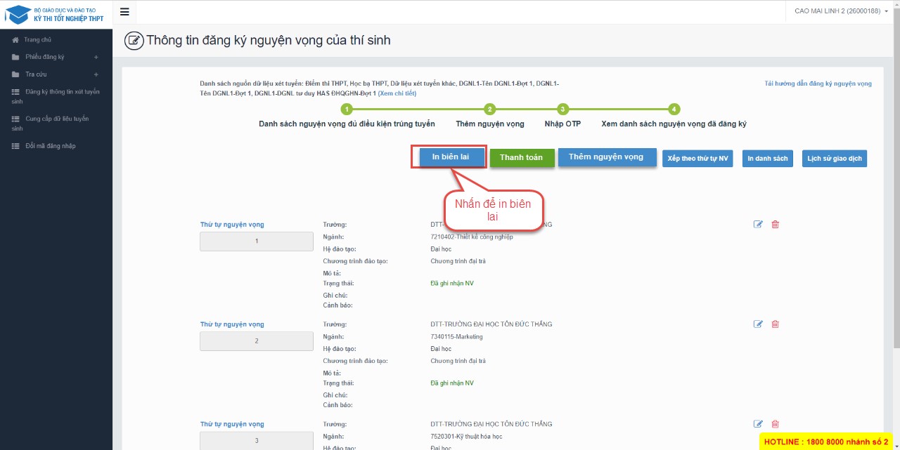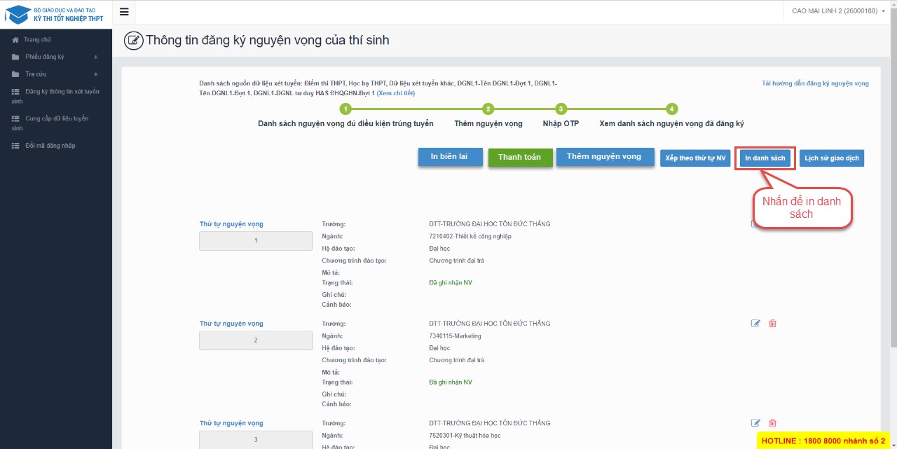 Thí sinh nhấn In danh sách để thực hiện in danh sách các nguyện vọng