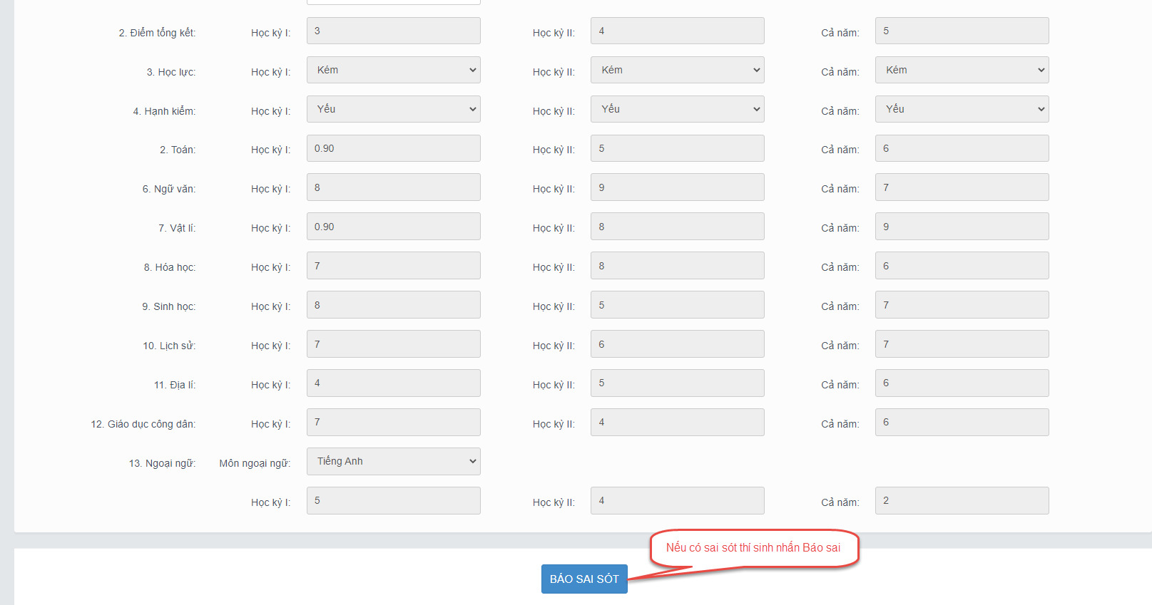 Bước 3: Sau khi xem điểm học bạ nếu thí sinh thấy có sai sót thì nhấn Báo sai sót (Lưu ý: Nút báo sai sót sử dụng để báo sai sót cho chả 3 năm học. Nếu thí sinh thấy có sai sót cả 3 năm học thì thực hiện báo sai sót cùng 1 lần)
