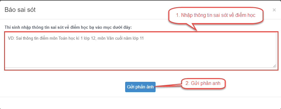 Bước 4: Sau khi nhấn Báo sai sót sẽ hiển thị màn hình để thí sinh nhập thông tin sai sót. Thí sinh nhập ví dụ: Sai thông tin Học lực học kì 1, Sai thông tinh điểm môn Toán học kì 1 lớp 12, môn Văn cuối năm lớp 11. Sau đó nhấn Gửi phản ánh
