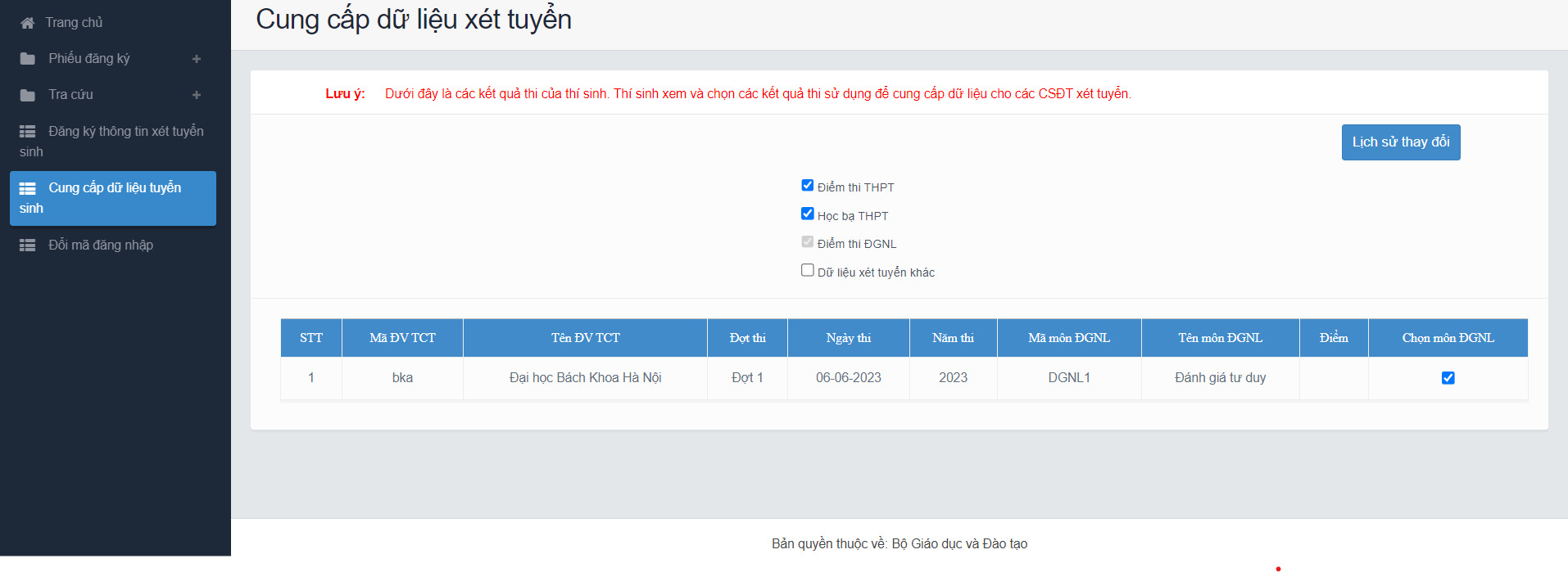 Hệ thống sẽ mặc định tích chọn nguồn điểm thi THPT, học và và điểm ĐGNL (nếu có) cho thí sinh, thí sinh có thể bỏ tích chọn. Ngoài ra thí sinh cần tự chọn dữ liệu xét tuyển khác