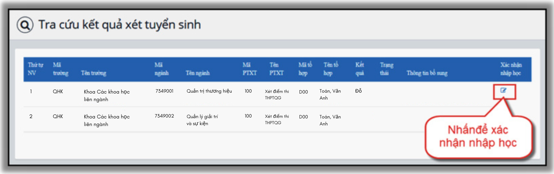 Để kiểm tra xem đã xác nhận nhập học thành công hay chưa thí sinh bấm vào mục tra cứu kết quả
