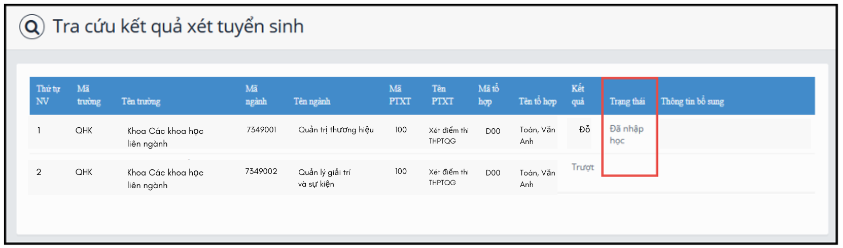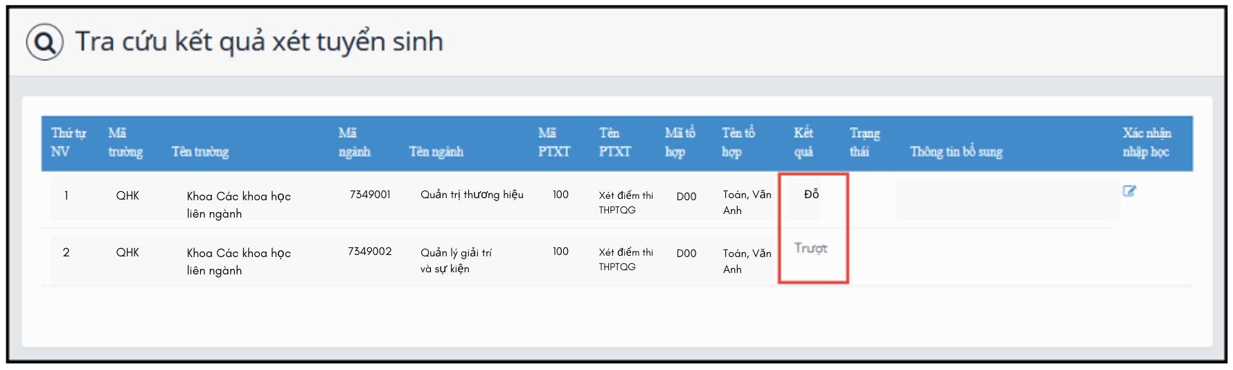 Nếu kết quả là Trượt có nghĩa là thí sinh trượt tất cả các nguyện vọng đã đăng ký vào Trường.