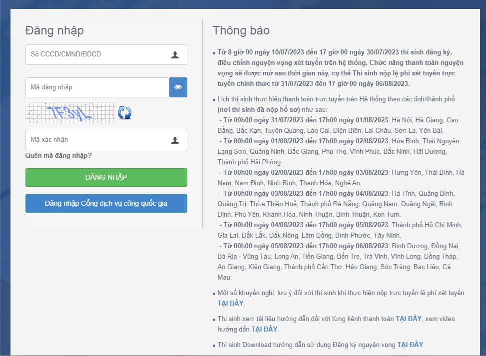 Thí sinh điền đầy đủ thông tin để đăng nhập bao gồm: