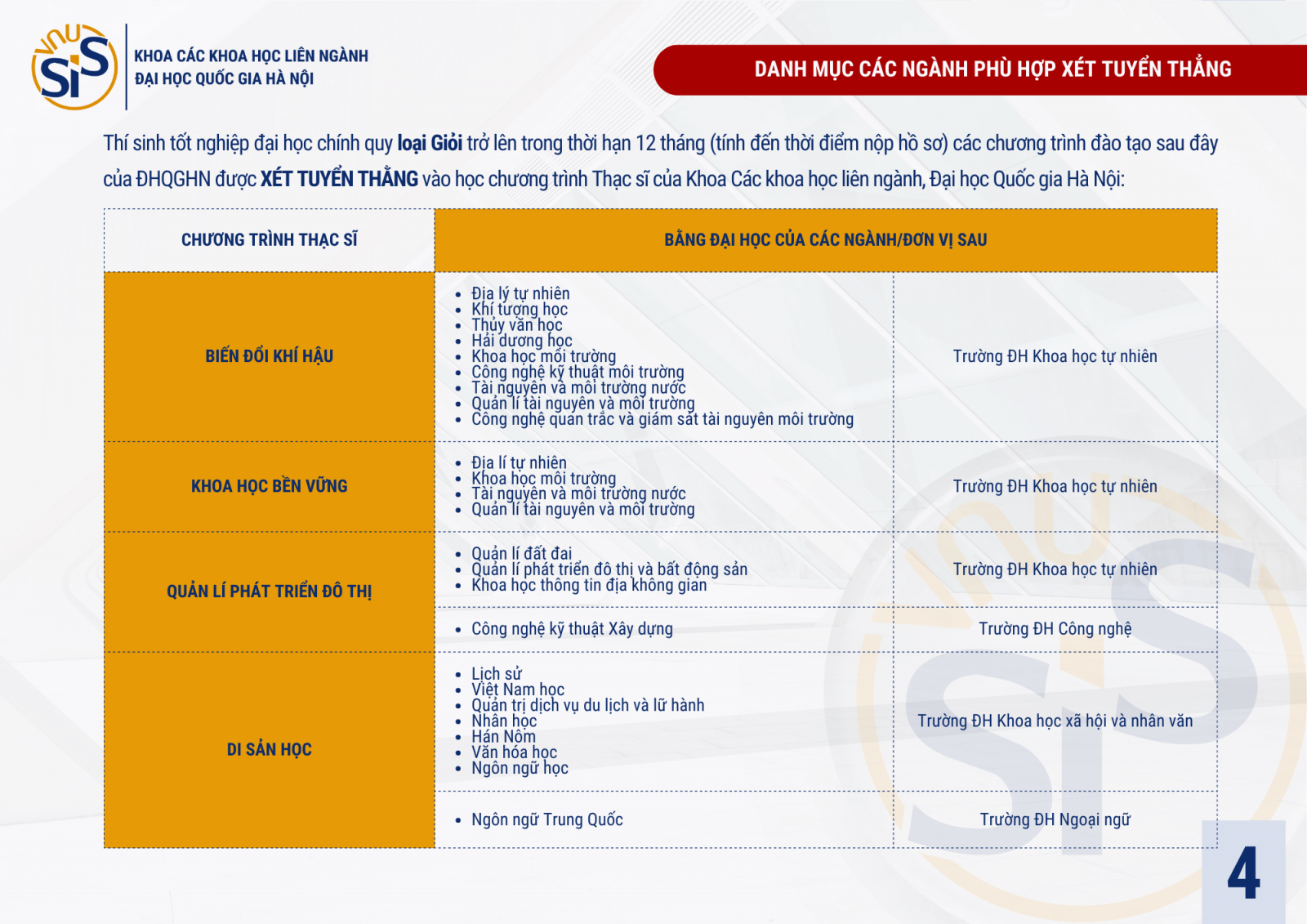 Riêng với thí sinh dự tuyển chương trình Thạc sĩ Biến đổi khí hậu và Thạc sĩ Khoa học bền vững của Đại học Quốc gia Hà Nội – là những ngành bao trùm mọi lĩnh vực, đầu vào sẽ mở rộng cho tất cả các chuyên ngành với điều kiện đi kèm tương ứng (Chi tiết xem tại ảnh 5 và 6 dưới đây).